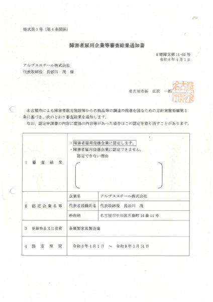 障害者雇用企等業認定の更新手続きを行い、「障害者雇用促進企業」に再認定いただきました。